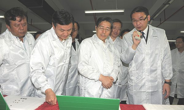 2011年6月21日,廣西壯族自治區(qū)黨委書(shū)記郭聲琨到北海調(diào)研千億元產(chǎn)業(yè)建設(shè)期間,在自治區(qū)黨委常委、政府副主席陳武,自治區(qū)黨委常委、統(tǒng)戰(zhàn)部部長(zhǎng)黃道偉,自治區(qū)政府副主席林念修,北海市長(zhǎng)連友農(nóng)等陪同下,赴中國(guó)電子北海產(chǎn)業(yè)園考察調(diào)研,并視察了國(guó)鈺電子、惠盛電子兩家入園企業(yè)。北海市委常委、常務(wù)副市長(zhǎng)孫大光介紹了北海電子信息產(chǎn)業(yè)發(fā)展情況。郭聲琨書(shū)記詳細(xì)詢問(wèn)了企業(yè)建設(shè)和發(fā)展情況,并親切看望和慰問(wèn)了園區(qū)一線的建設(shè)者,并對(duì)他們?yōu)楸焙?、為廣西的經(jīng)濟(jì)建設(shè)付出的努力表示感謝。